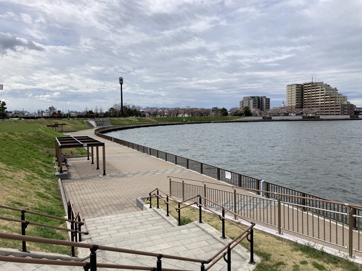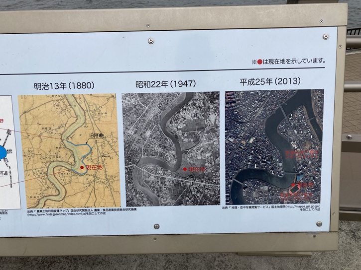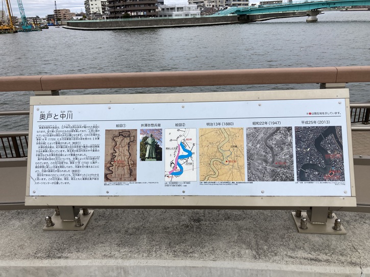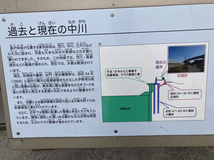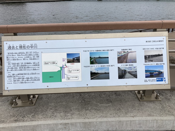 中川に面してビュースポットが設置されていて、多数のパネルが並んでいます。