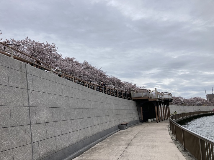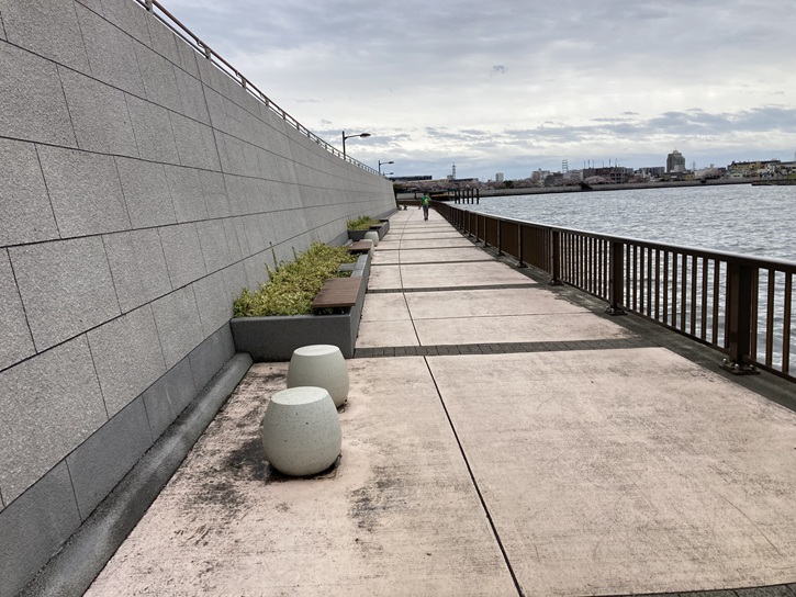 中川のテラスを歩きます。所々に休息スペースが設けられていて、川風が身持ち良さそうです。