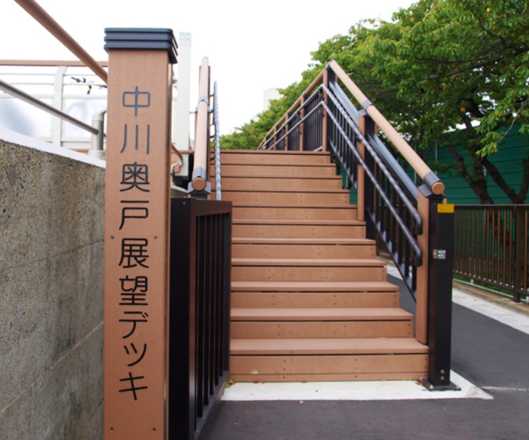 中川沿いに整備された8.8kmの遊歩道「中川テラス」が大曲りしているところに、2013年に中川奥戸展望デッキと呼ばれるビューポイントが造られました。