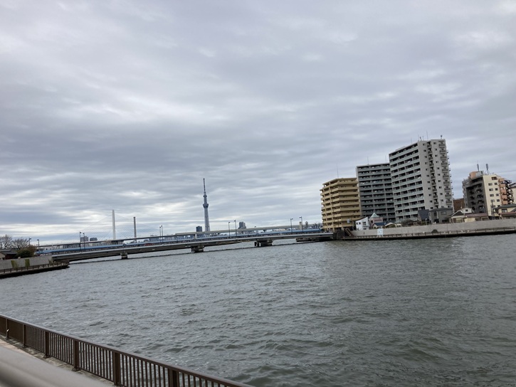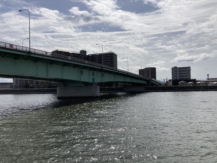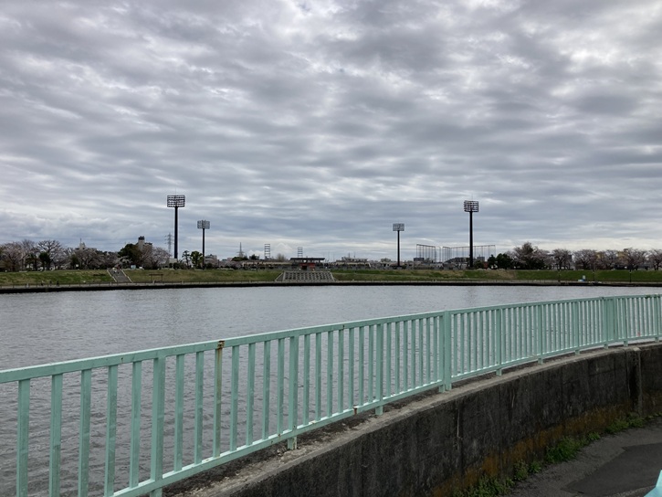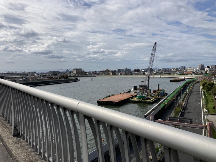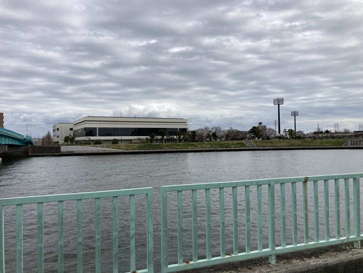 奥戸橋の袂からは、対岸の奥戸スポーツセンター体育館と中川奥戸展望デッキが真正面に眺められます。