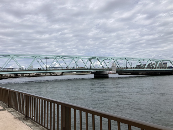 青砥橋の幅員は両側の歩道を含めて23mあり、広々とした感じです。欄干越しに、湾曲した中川の流路を見て取れます。