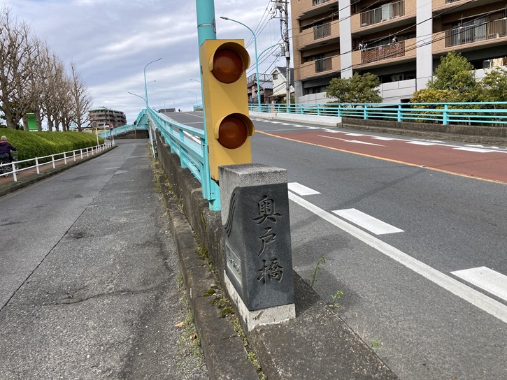奥戸橋は、中川の右岸(西詰)の立石八丁目と左岸(東詰)の奥戸七丁目の間を結んでいる橋です。現在の橋は、1972年に竣工し、過去には幾度かの架け替えが行われています。奥戸橋の架橋前、奥戸橋付近は下総国府に続く古代東海道の推定路に当たり、同時に江戸時代以降の立石道のルート上に位置していたため、古くから人々の往来があったと考えられています。一方、奥戸橋の架かる付近は享保年間に新たに開削された部分で、明治時代にこの場所には「奥戸新田の渡し」または「新渡」と呼ばれる渡船が存在しました。かって、東京府南葛飾郡奥戸村は西方の村境が中川になっていて、中川を渡る手段は5箇所の渡船(曲金の渡し・諏訪野の渡し・奥戸新田の渡し・奥戸の渡し・上平井の渡し)しかなく不便でした。大正元年(1912年)10月、奥戸村の石井源治ほか19人によって私設による橋梁架設の出願が行われ、翌大正二年(1913年)6月に賃取橋として認可されました。橋は翌大正三年(1914年)3月に竣工し、4月1日に開通しました。橋は木造で、長さ77間・幅2間半(長さ140m・幅4.5m)でした。私設の賃取橋だった奥戸橋は、その後東京府によって買収・管理されることになりましたが、幾度かの洪水によって流出や破損が相次ぎ、その都度架け替えが行われました。大正十二年(1923年)の関東大震災の直後にも復旧工事が行われました。昭和二十二年(1947年)9月14日から15日にかけて関東地方を襲ったカスリーン台風とそれに伴う洪水により、奥戸橋の橋の中央部は破損・流出しました。奥戸橋の復旧工事は2年後の昭和二十四年(1949年)8月8日に完成し、このときの橋は全長140m・幅員3mの木橋で、その橋材は主に荒川下流の葛西橋のものが利用されました。現在の橋は、旧橋の下流に架けられ、昭和四十二年(1972年)11月に竣工し、翌12月に開通しました。