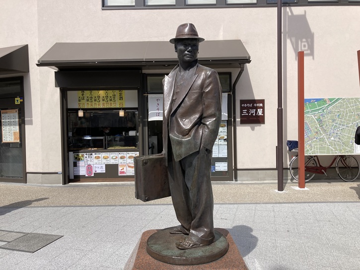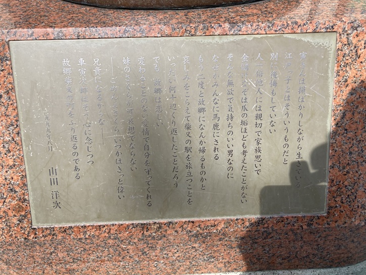 葛飾柴又といえば、「男はつらいよ」のフーテンの寅さんですね。映画「男はつらいよ」は、昭和四十四年(1969年)から平成九年(1997年)まで全49作品が制作された日本を代表する映像作品です。第一作が公開されてから50周年となる令和元年には、50作目である「男はつらいよ お帰り寅さん」が公開されました。駅前広場には、1999年に地元商店会と観光客の募金によって建てられた「旅に出る寅さんがさくらの方を振り返ったシーン」をモチーフとした寅さんの銅像があります。銅像の台座には、山田洋次監督による寅さんの故郷への思いが刻まれたプレートが貼られています。