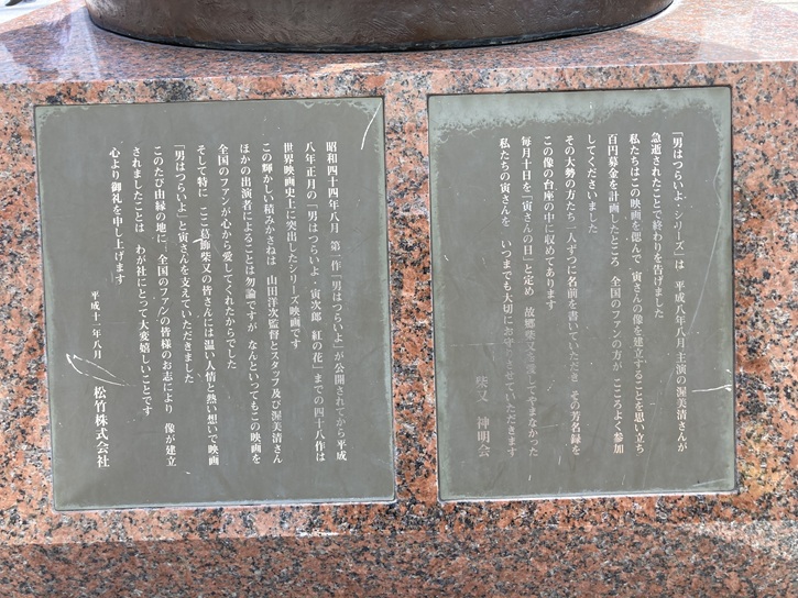 「男はつらいよ・シリーズ」は平成八年八月、主演の渥美清さんが急逝されたことで終わりを告げました。私たちはこの映画を偲んで、寅さんの像を建立することを思い立ち、百円募金を計画したところ、全国のファンの方がこころよく参加してくださいました。その大勢の方たち一人ずつに名前を書いていただき、その芳名録をこの像の台座の中に収めてあります。毎月十日を「寅さんの日」と定め、故郷柴又を愛してやまなかった私たちの寅さんをいつまでも大切にお守りさせていただきます。