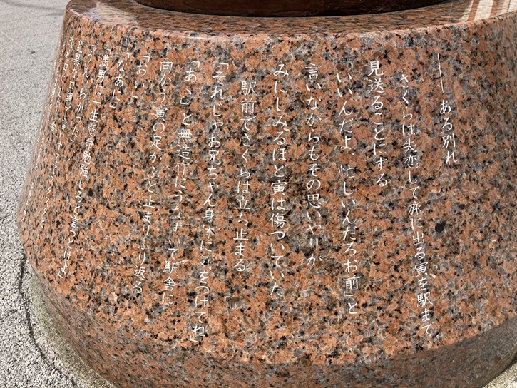 さくらの像は後から建ったのですが、寅さんとさくらの視線が最初から構図されたようにピッタリ合っていますね。