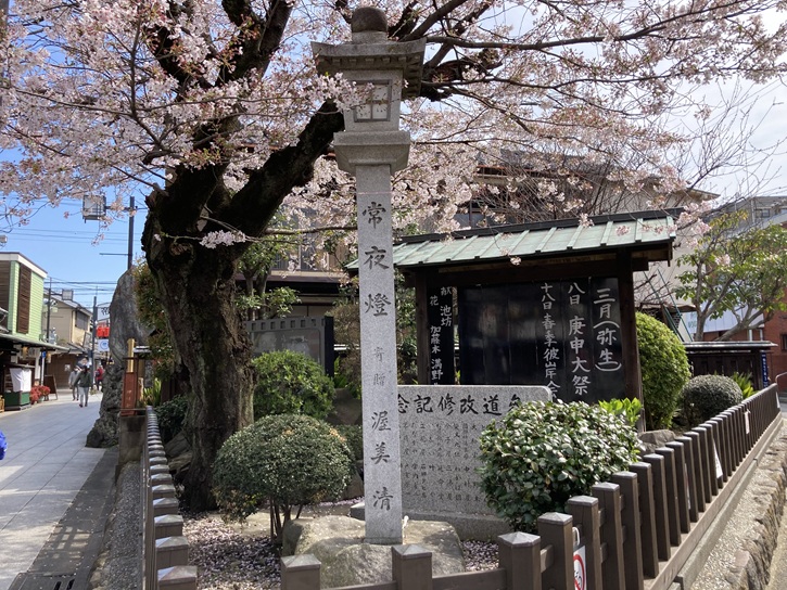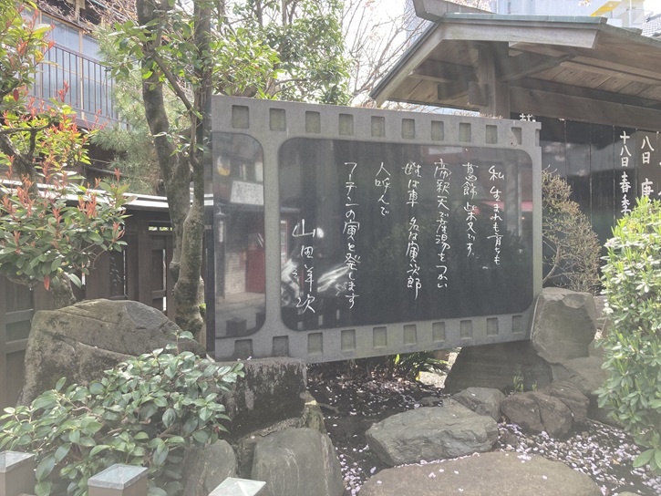 渥美清さんが寄贈した常夜灯と寅さんの口上を記した石版が建っています