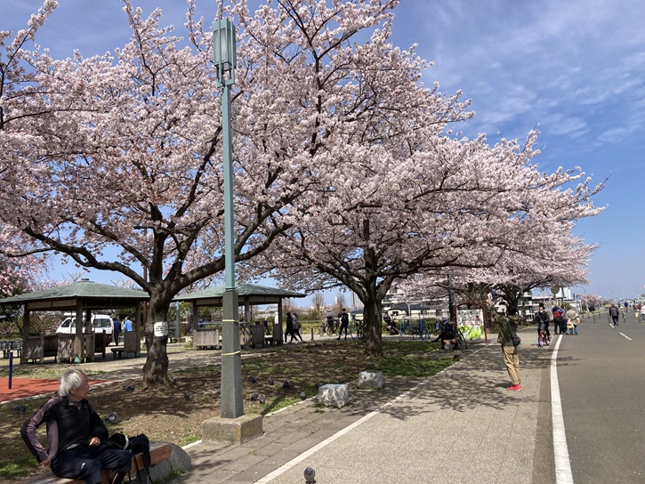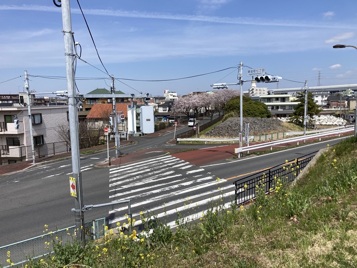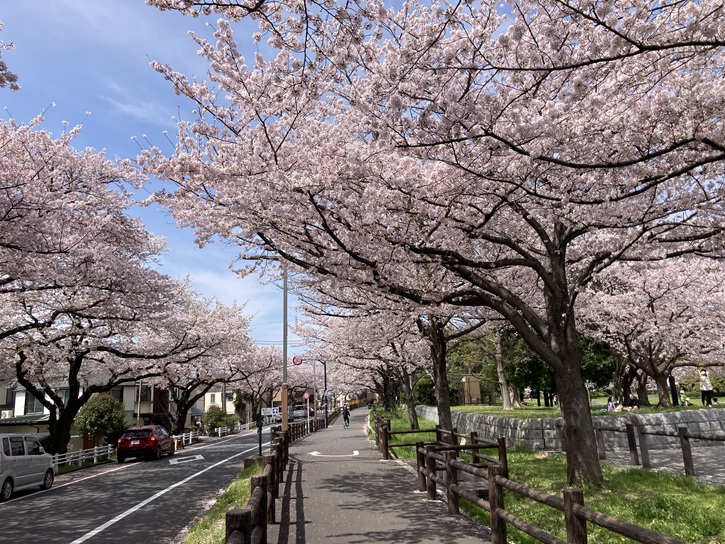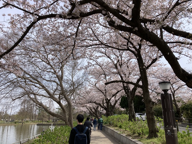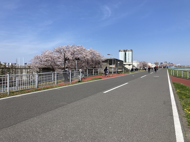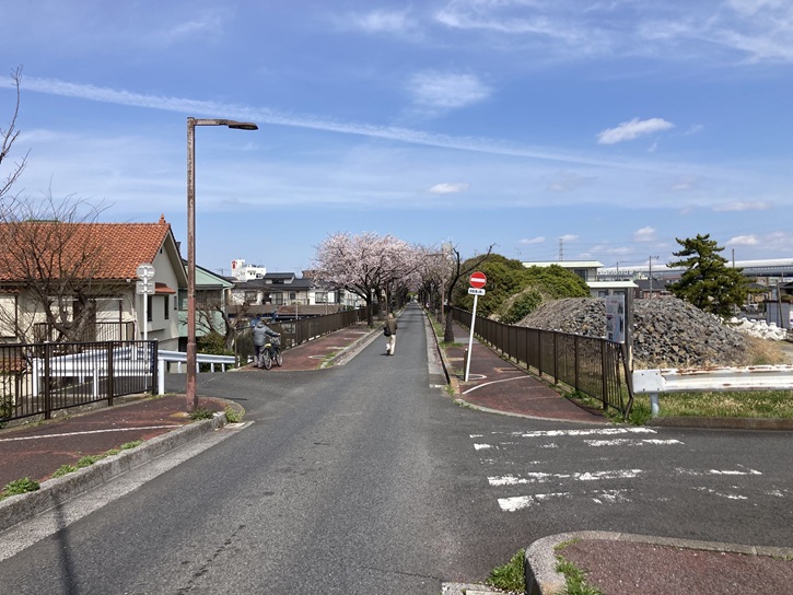 内溜(うちだめ)の東岸を進んで岩槻街道の岩槻橋交差点に出て、葛飾区立水元図書館前の桜並木を東京理科大学方向に進みます。