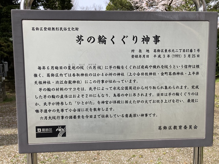 毎年6月晦日の夏越の祓(六月祓)に茅の輪をくぐれば疫病や穢れを祓うという信仰は根強く、葛飾区内では香取神社のほか4か所の神社(上小合日枝神社・金町葛西神社・上平井天祖神社・渋江白髭神社)にこの行事が伝わっています。茅の輪の材料のマコモは、氏子によって水元公園周辺から刈り取られ集められます。完成した茅の輪の直径はおよそ2mにもなり、鳥居の中に吊されます。当日は茅の輪くぐりのほか、氏子が持参した「ひとがた」を神官が拝殿に据えた炉の火でお炊き上げを行い、最後に囃子連中の先導で小合溜に灰を散布します。六月大祓行事の諸要素を今日まで伝承している意義深い神事です。