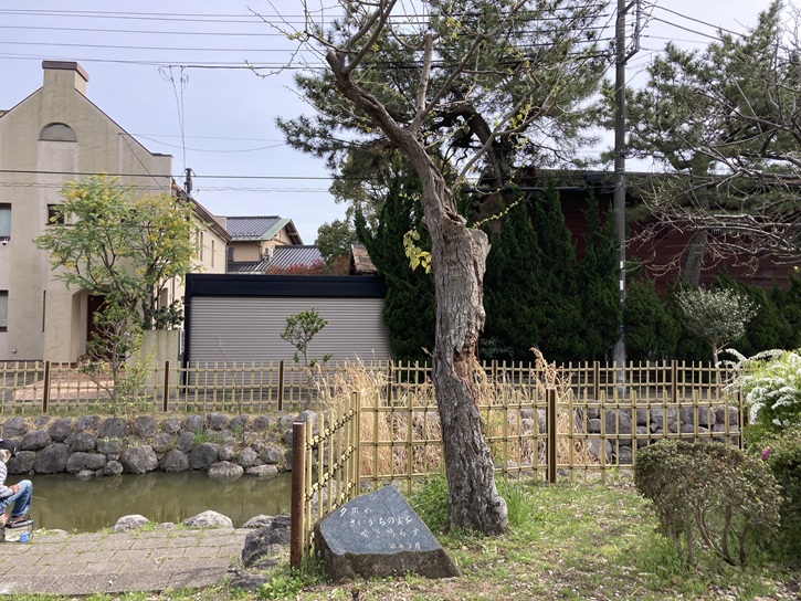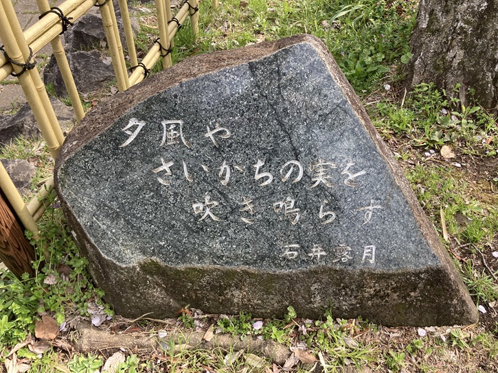 水路の脇に句碑が置かれています。石井露月は俳人で、雨に濡れた若葉に月影が差すのを見て露月と号するようになりました。脚気に悩まされながらも度々上京して正岡子規に師事し、本格的に俳句を学ぶようになりました。後半の人生は医師免許を得て郷里の秋田県で医院を開き、俳誌を刊行するなど村の発展に尽くしました。