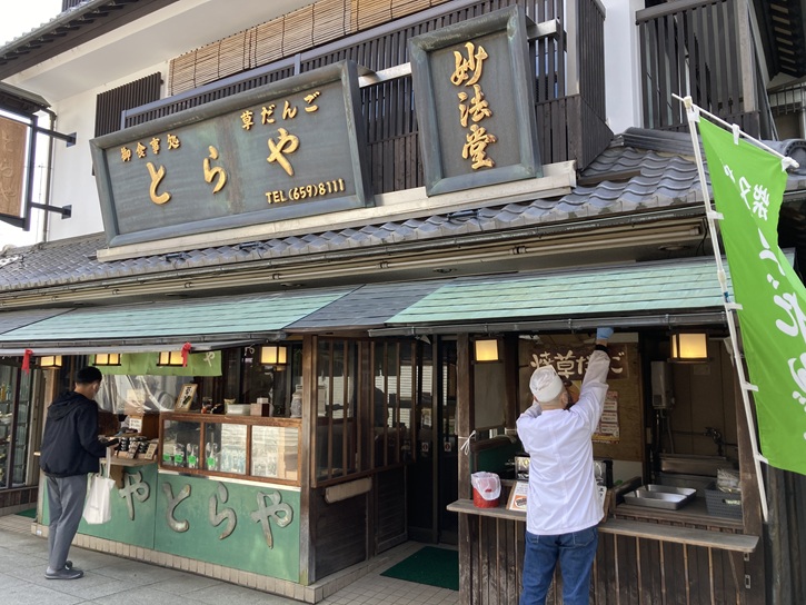 「とらや」の創業は明治二十年で、店内では、和食・中華・甘味など種類豊富なお食事が楽しめます。お土産には、柴又名物の「草だんご」が人気です。お店は、「男はつらいよ」の撮影で使用されました。