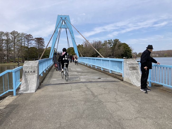 内溜と外溜の境の遊歩道を通って対岸に渡ります。左手には先ほど通った水元大橋が架かっています。