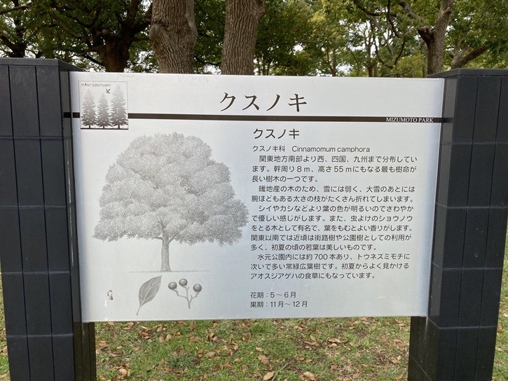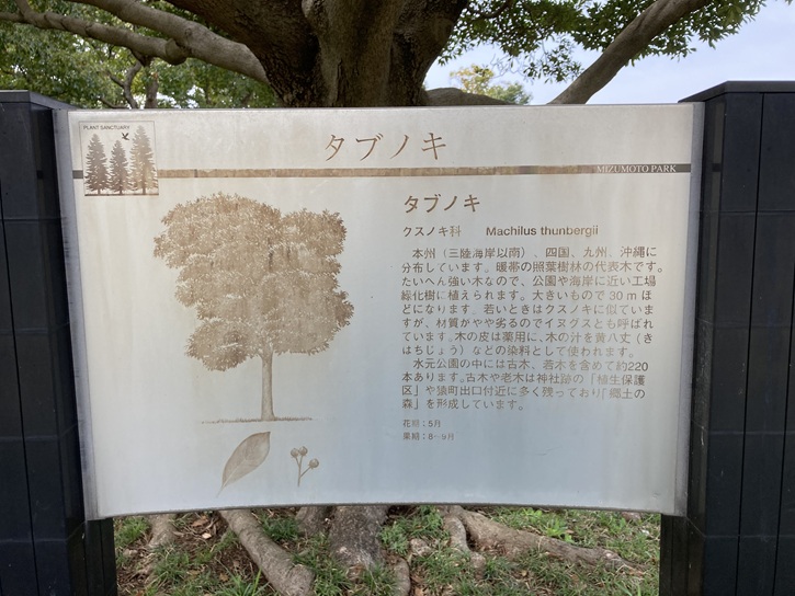 本州(三陸海岸以南)、四国、九州、沖縄に分布しています。暖帯の照葉樹林の代表木です。たいへん強い木なので、公園や海岸に近い工場緑化樹に植えられます。大きいもので30mほどになります。若いときはクスノキに似ていますが、材質がやや劣るのでイヌグスとも呼ばれています。木の皮は薬用に、木の汁を黄八丈(きはちじょう:注記)などの染料として使われます。水元公園の中には古木、若木を含めて約220本あります。古木や老木は神社跡の「植生保護区」や猿町出口付近に多く残っており「郷土の森」を形成しています。
