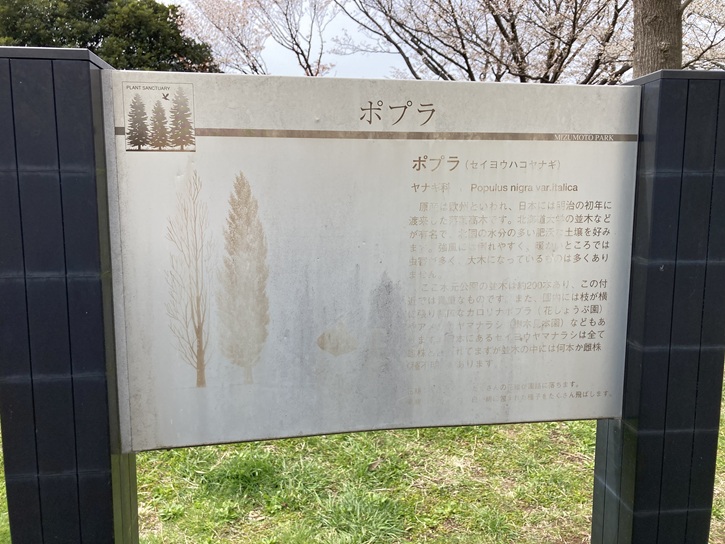 原産は欧州といわれ、日本には明治の初年に渡来した落葉高木です。北海道大学の並木などが有名で、北国の水分の多い肥沃な土壌を好みます。強風には倒れやすく、暖かいところでは虫害が多く、大木になっているものは多くありません。ここ水元公園の並木は約200本あり、この付近では貴重なものです。また、園内には枝が横に張り幅広なカロリナポプラ(花しょうぶ園)やアメリカヤマナラシ(樹木見本園)などもあリます。日本にあるセイヨウヤマナラシは全て雄株と言われてますが並木の中には何本か雌株(種不明)があります。