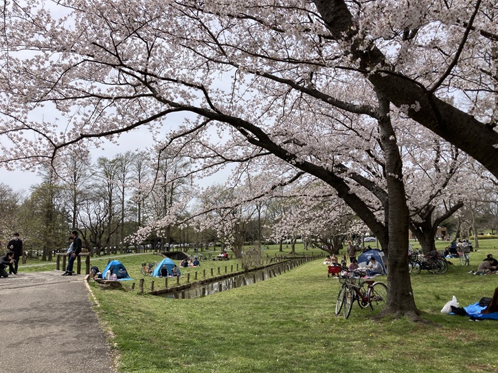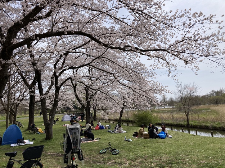 満開の桜の木の下でお花見です。