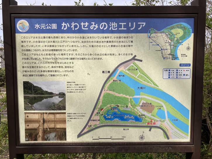このエリアは水元公園の最も西側にあり、中川から小合溜に水を引いている場所で、小合溜の始まりの場所です。小合溜は古くは大場川と江戸川へつながり、治水のための遊水池や農業用のため池として機能していましたが、いまは直接はつながっていません。しかし、大場川の広々とした景観は小合溜の穏やかな景観とつながり、水元の水郷景観を形づくっています。このエリアはもともと釣堀のあった場所ですが、そのころから多くの水辺の鳥が飛来し、多くの生き物が生息していました。そのなかでもカワセミが多く観察できる場所となっております。このエリアは、これらのカワセミをはじめとする様々な生物のすみかとして、森林や草地、湿地などが組み合わさった多様な環境を復元し、いきものを身近に観察できる場所として整備されています。