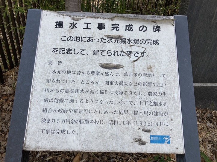 水元の地は昔から農業が盛んで、葛西米の産地として知られていた。ところが、関東大震災などの影響で江戸川からの農業用水が減り稲作に支障をきたし、農家の生活は危機に瀕するようになった。そこで、上下之割水利組合が政府や東京府にかけあった結果、揚水場の建設が決まり5万円余の巨費を投じ、昭和十年(1935年)4月に工事は完成した。