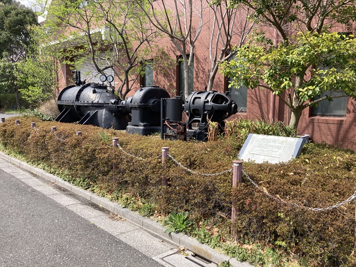 水元揚水場で使用されていた巨大なポンプが保存・展示されています。