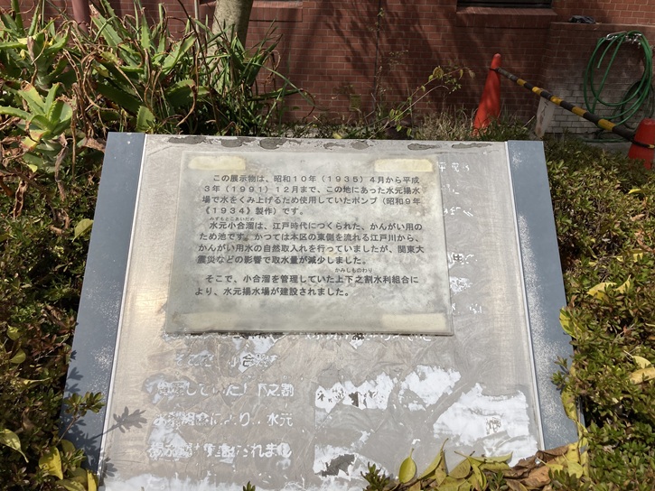 この展示物は、昭和十年(1935年)4月から平成三年(1991年)12月まで、この地にあった水元揚水場で水をくみ上げるため使用していたポンプ(昭和九年《1934年》製作)です。水元小合溜は、江戸時代につくられた、かんがい用のため池です。かつては本区の東側を流れる江戸川から、かんがい用水の自然取入れを行っていましたが、関東大震災などの影響で取水量が減少しました。そこで、小合溜を管理していた上下之割水利組合により、水元揚水場が建設されました。