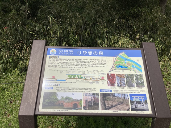 旧浅間神社はこの森にありましたが公園整備の際に移転し、水元猿町の鎮守・香取神社と合祀され、社合を水元神社と改めています。