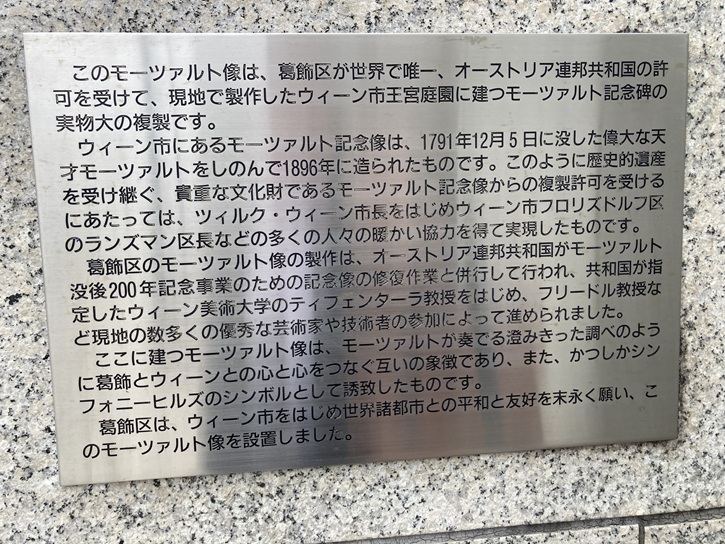 のランズマン区長などの多くの人々の暖かい協力を得て実現したものです。葛飾区のモーツァルト像の製作は、オーストリア連邦共和国がモーツァルト没後200年記念事業のための記念像の修復作業と併行して行われ、共和国が指定したウィーン美術大学のティフェンターラ教授をはじめ、フリードル教授など現地の数多くの優秀な芸術家や技術者の参加によって進められました。ここに建つモーツァルト像は、モーツァルトが奏でる澄みきった調べのように葛飾とウィーンとの心と心をつなぐ互いの象徴であり、また、かつしかシンフォニーヒルズのシンボルとして誘致したものです。葛飾区は、ウィーン市をはじめ世界諸都市との平和と友好を末永く願い、このモーツァルト像を設置しました。