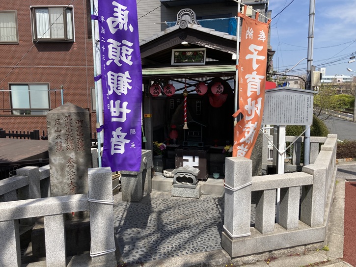 本奥戸橋西詰の手前から中川右岸緑道に入ります。本奥戸橋西詰に小さな地蔵尊が祀られています。堂内には、地蔵尊と馬頭観音が祀られています。道しるべは、お堂の脇に建っています。