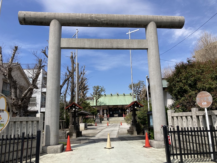 平和橋を渡って、平和橋通りをゴール地点の新小岩駅に向かって進みます。平和橋東詰の先に天祖神社があります。