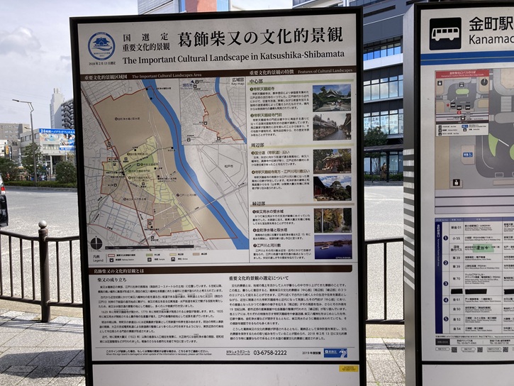 駅前広場に面して、葛飾柴又について解説した案内板が立っています。