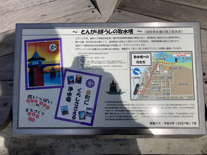 このベンチは、金町六丁目駅前地区第一種市街地再開発事業の実施に伴い、金町駅前に創出された空間を活用し、憩いの場、待ち合わせの場として、金町駅前の活気とにぎわいづくりを目的に、再開発事業の竣工にあわせて、金町六丁目駅前地区市街地再開発組合が設置した「デザインベンチ」です。デザインベンチに設置された花壇の花の管理は、葛飾区の「花いっぱいのまちづくり」の活動と連携しています。