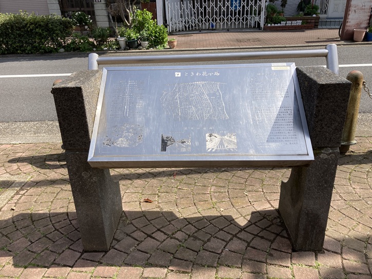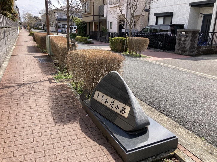 この道路は、地域の皆さんに親しんでいただくため、道路名称を一般募集しました。”ときわ”という名は、とこしえに緑をたたえるという意味から永遠の繁栄を願ったもので、金町村当時の字名でもありました。そして、四季折々の花を植えてあります。電線の地中化により、電柱のないすっきりとした空のもとで、四季の景観をゆっくり楽しめます。道路のあちこちにある青銅色の車止めは、この地域が昔、北条氏と里見氏の合戦の場ということから、かぶとを模して造ったものです。このようにして、ときわ花小路は、地域の皆さんが憩い、ふれあうことのできる道路として生まれ変りました。