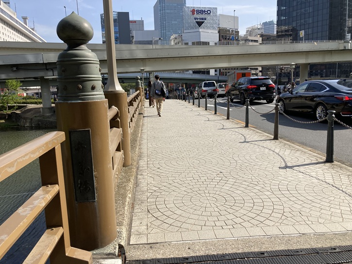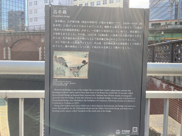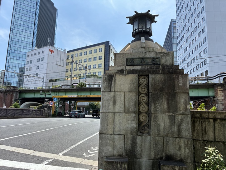 ここは、芝崎口門・神田口門・大炊殿橋門とも呼ばれ、将軍が上野寛永寺に参詣に行くための御成道となるため、門の警備は厳重でした。門は、寛永六年(1629年)に下野真岡藩(現在の栃木県)藩主稲葉正勝によって構築されました。対岸の鎌倉河岸は江戸城築城の資材を荷揚げする河岸場だったので、この門の役割は重要でした。明治六年(1873年)に櫓門が撤去され、明治十七年(1884年)に木橋が架け直されました。道路の拡張と市電の開通に伴い改修され、関東大震災で焼け落ちた後に新たに架橋されました。現在の橋は、昭和五十五年(1980年)に改架されたもので、木橋風の意匠に、灯籠風の親柱と石造風の高欄を組み合わせています。