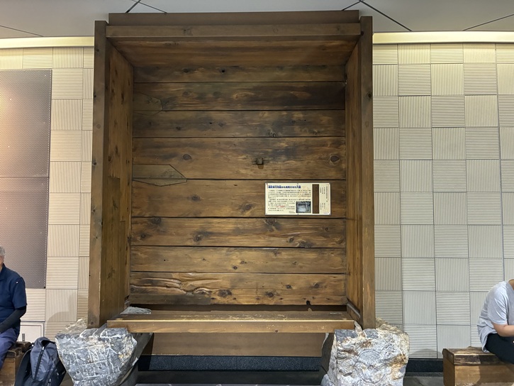 地下広場に降りると、そこには南町奉行所内に掘られた「穴蔵(地下室)」が壁に立てて展示されています。この穴蔵からは、伊勢神宮の神官が大岡忠相に宛てた木札が出土しました。両脇にある木製ベンチは、「木樋(江戸時代の水道管)」を再利用したものです。