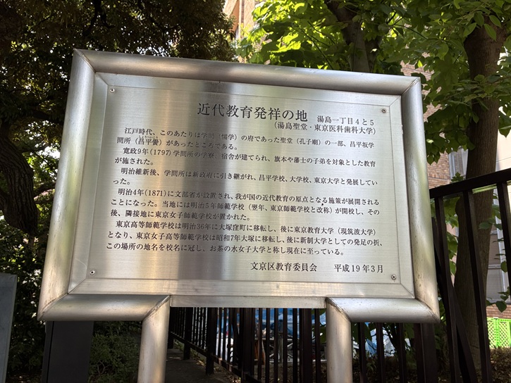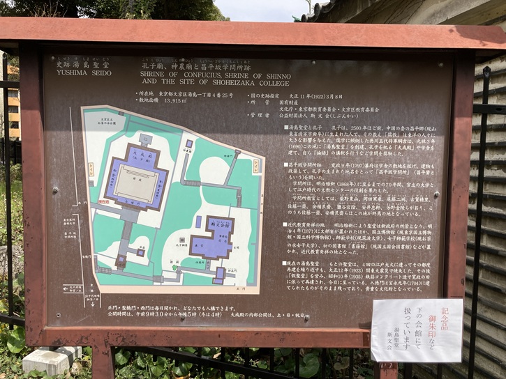 神田明神からお茶の水方面に下って聖橋の手前にある。創立者は徳川家康をはじめ4代の将軍の侍講を務めた儒学者林羅山だ。寛永七年(1630年)に私塾として開設し、のちに幕府直轄の学問所に発展。聖堂には、儒学の創始者である礼子が祀られている。