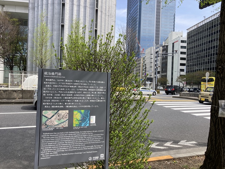 JR東京駅八重洲口前を通る外堀通りは、かつて江戸城の外堀だった場所。鍛冶橋門は、寛永六年(1629年)に秋月藩主黒田長興らによってつくられたが、現在は説明板が残るのみ。門前には御用絵師として江戸城本丸の襖絵を描いた狩野探幽の屋敷があった。