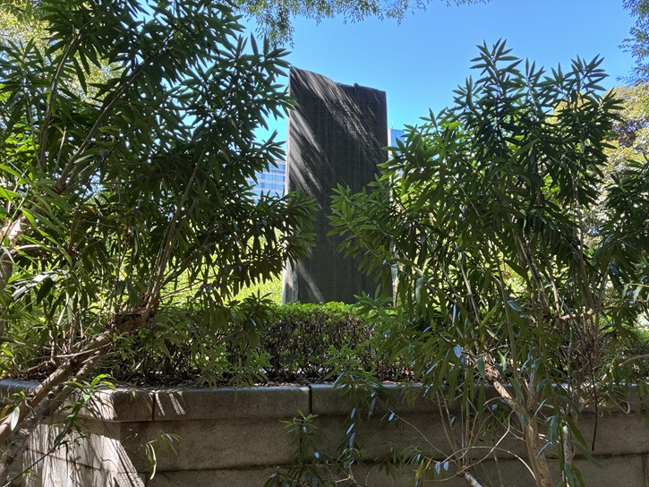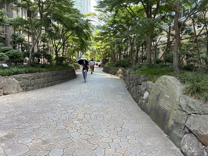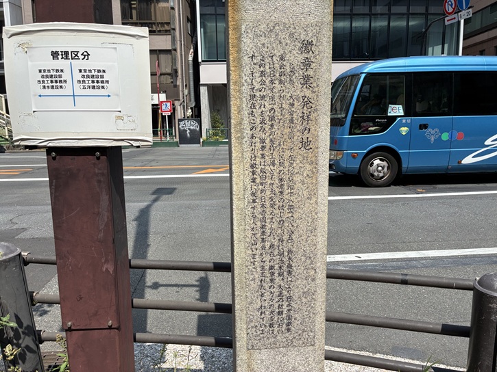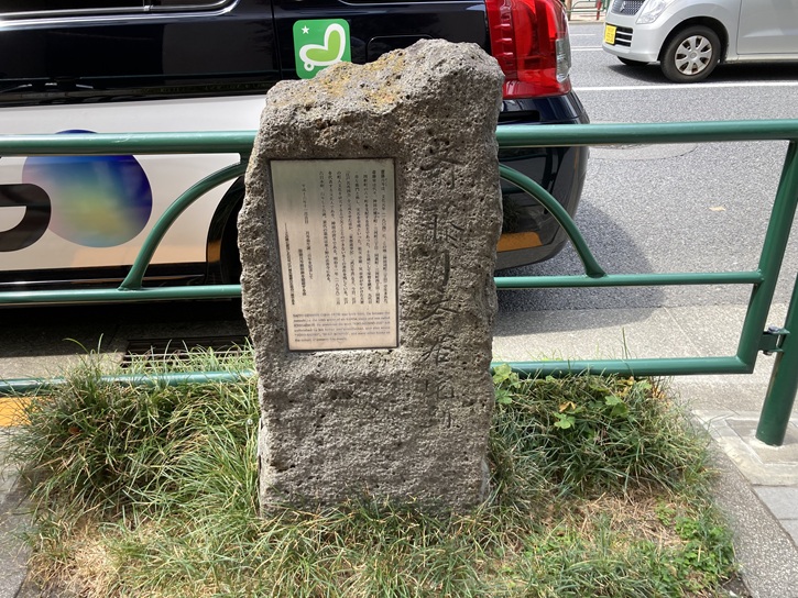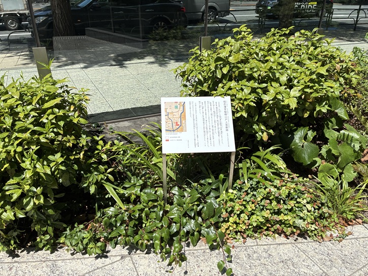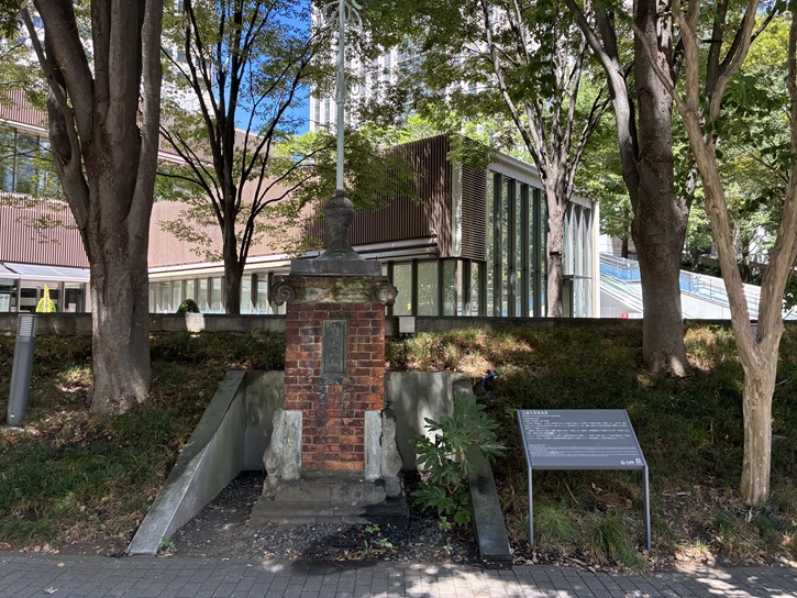 歩道の脇の植え込みに工部大学校跡のモニュメントが立っています。