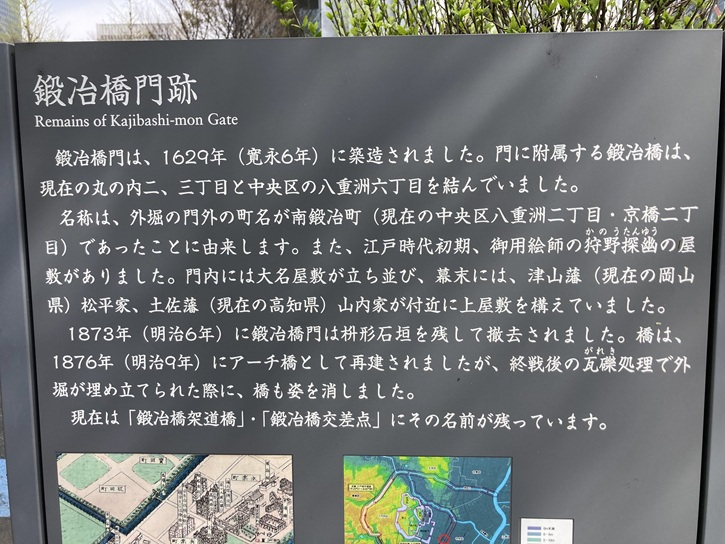 鍛冶橋門は、寛永六年(1629年)に築造されました。門に附属する鍛冶橋は、現在の丸の内二、三丁目と中央区の八重洲六丁目を結んでいました。名称は、外堀の門外の町名が南鍛冶町(現在の中央区八重洲二丁目・京橋二丁目)であったことに由来します。また、江戸時代初期、御用絵師の狩野探幽の屋敷がありました。門内には大名屋敷が立ち並び、幕末には、津山藩(現在の岡山県)松平家、土佐藩(現在の高知県)山内家が付近に上屋敷を構えていました。明治六年(1873年)に鍛冶橋門は枡形石垣を残して撤去されました。橋は、明治九年(1876年)にアーチ橋として再建されましたが、終戦後の瓦礫処理で外堀が埋め立てられた際に、 橋も姿を消しました。現在は「鍛冶橋架道橋」・「鍛冶橋交差点」にその名前が残っています。