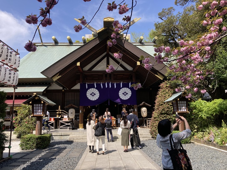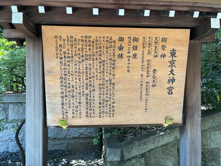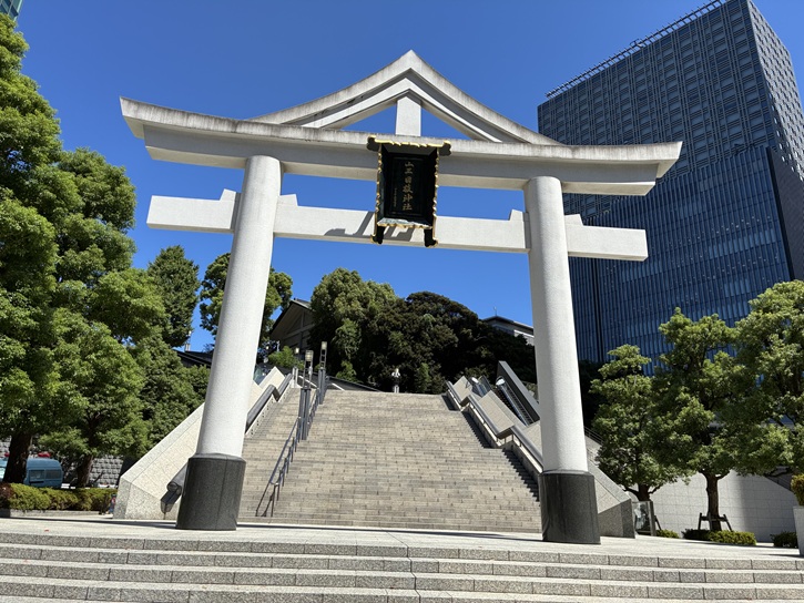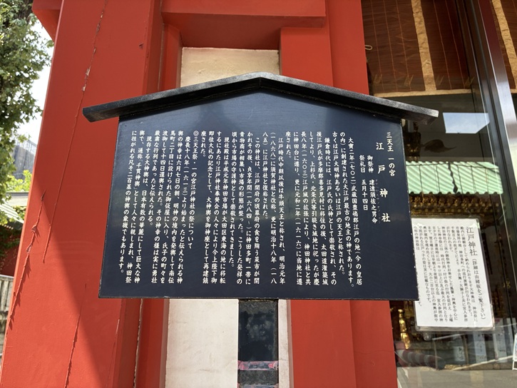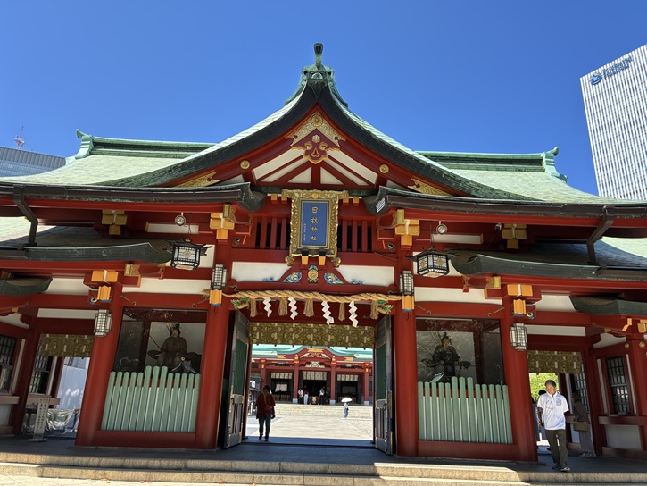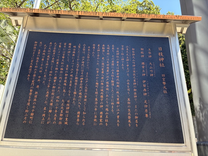 山王日枝神社は東京十社の一社で、江戸三大祭のひとつである山王祭が行われることで知られています。山王日枝神社の創建年代ははっきりしていませんが、文明十年(1478年)に太田道灌が江戸城築城に当たって川越の無量寿寺(現在の喜多院・中院)の鎮守である川越日枝神社を勧請したことに始まるといわれています。徳川家康が江戸に移封された際に、城内の紅葉山に遷座して江戸城の鎮守としました。慶長九年(1604年)に始まった徳川秀忠による江戸城改築の際に社地を江戸城外の麹町隼町に遷座し、庶民が参拝できるようになりました。明暦三年(1657年)の明暦の大火によって社殿が焼失したため、万治二年(1659年)に将軍家綱が赤坂の松平忠房の邸地を社地に当て、現在の地に遷座しました。この地は江戸城から見て裏鬼門に位置します。