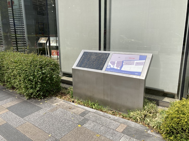 駅前広場に「南町奉行所跡の碑」が建っています。宝永四年(1707年)から幕末まで、数寄屋橋門内の此の地に南町奉行所が置かれ、「大岡越前守忠相」が南町奉行を約20年間務めていました。南町奉行所は老中の支配下にあり、江戸町人地の行政・司法・警察などの職務を担っていた組織です。大岡越前守忠相は、八代将軍徳川吉宗の側近として「享保の改革」を支え、江戸市中の行政に携わりました。石碑の横には、当時の「石組下水溝」が復元展示されています。