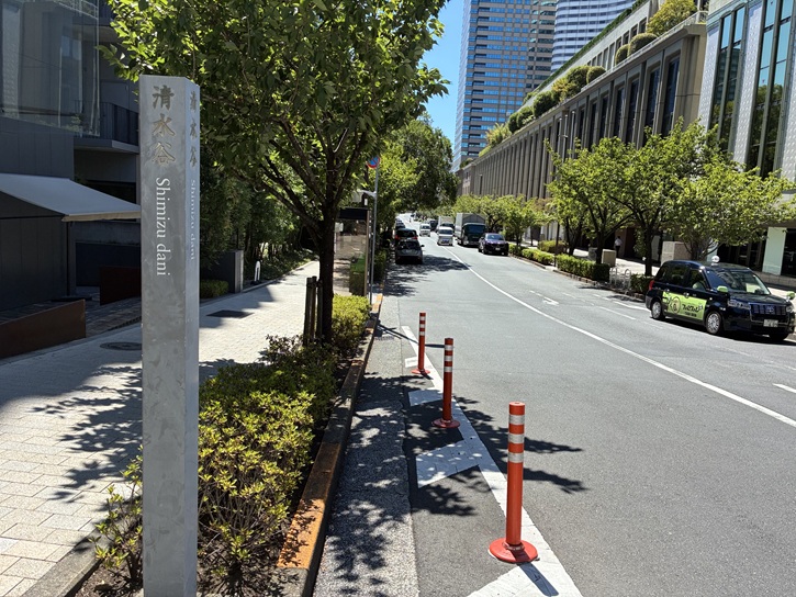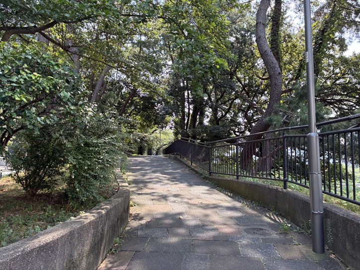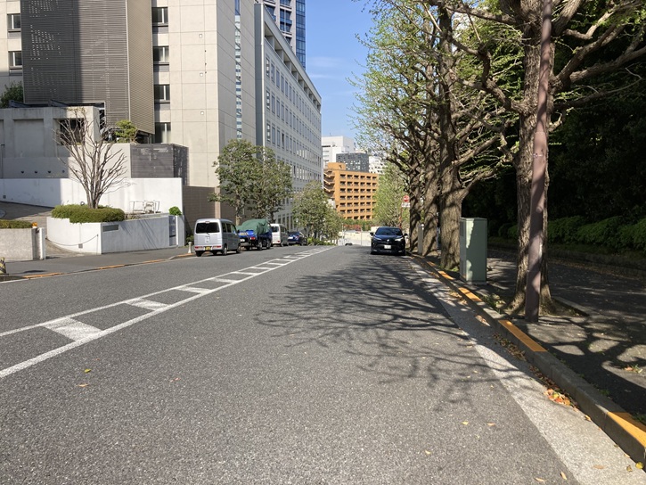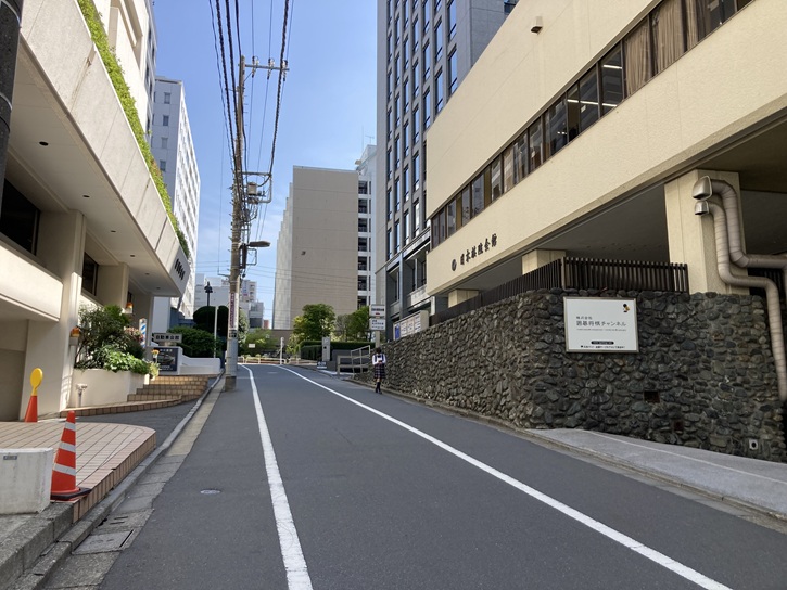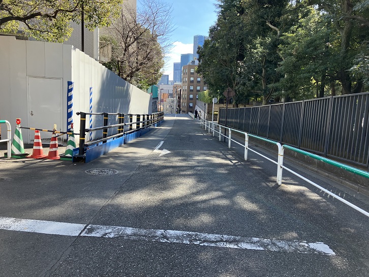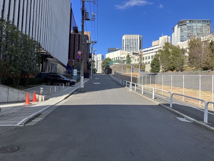 平河町交差点で青山通りを渡って、富士見坂の反対側に出ます。参議院議長公邸の裏門の前に坂道が下っています。