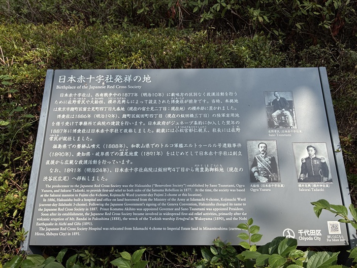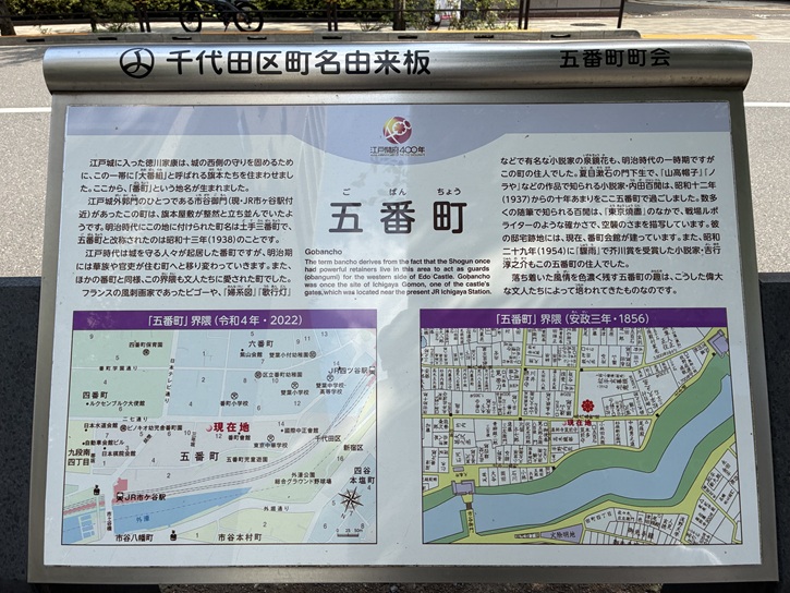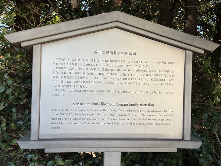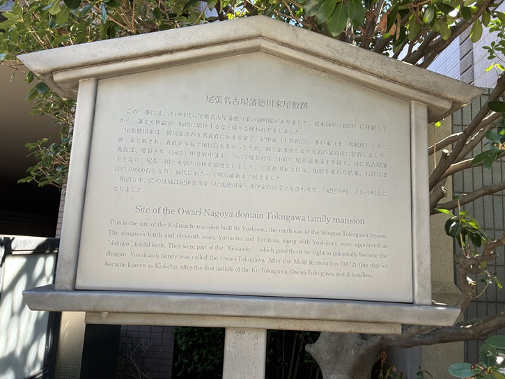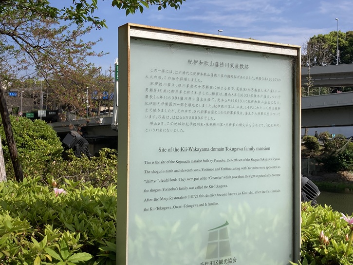 This is the site of the Kojimachi mansion built by Yorinobu, the tenth son of the Shogun Tokugawa Ieyasu. The shogun's ninth and eleventh sons, Yoshinao and Yorifusa, along with Yorinobu were appointed as "daimyo", feudal lords. They were part of the "Gosan-ke" which gave them the right to potentially become the shogun. Yorinobu's family was called the Kii-Tokugawa. After the Meiji Restoration (1872) this district become known as Kioi-cho, after the first initials the Kii-Tokugawa, Owari-Tokugawa and Ii families.