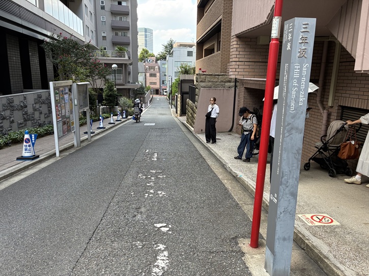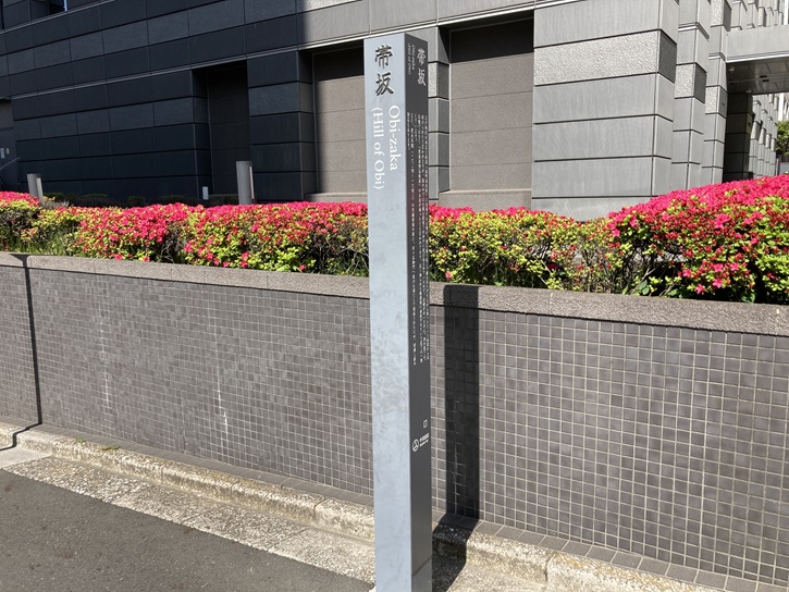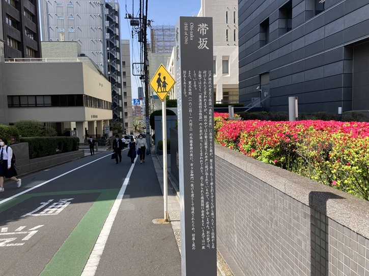 三べ坂は長さが約230mほどのやや急な下り坂で、別名を「三辺坂・水坂」といいます。江戸時代に、岡部(筑前守)・阿部(摂津守)・渡辺(丹後守)の三つの“べ”の付く屋敷が連なっていたことが坂名の由来になっています。