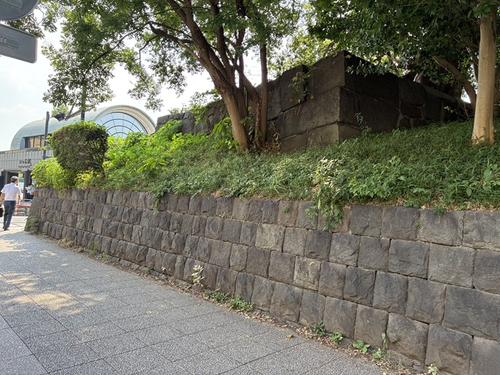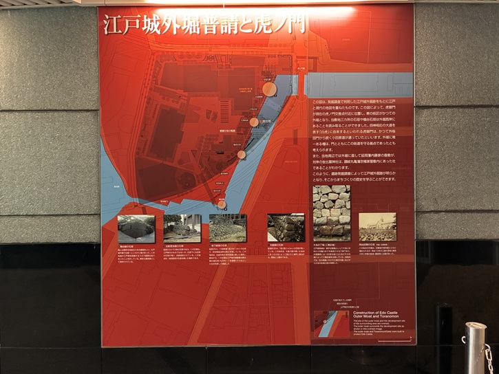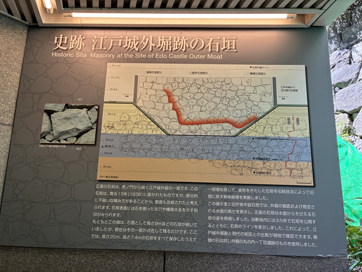 東京メトロ虎ノ門駅付近には、外堀の石垣が数か所に残っています。もともとは高さ9mほどの石垣が続いていましたが、現在はその一部が点在するのみです。ここでは長さ20m・高さ7.4mの石垣を保存したうえで一部を埋め戻して虎ノ門駅の文部科学省連絡通路内で展示されています。説明板には当時の石積工法や工事について記されています。