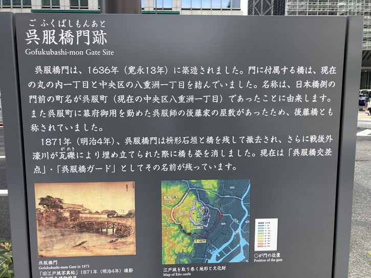 Gofukubashi-mon Gate was constructed in 1636. The bridge leading to the gate connected current-day Marunouchi 1-chome with Yaesu 1-chome in Chuo City. The name derives from the fact that the locality adjacent to the gate on the Nihombashi Bridge side was called Gofukucho (current-day Yaesu 1-chome, Chuo City). It was also called Gotobashi Bridge, as the residence of the Goto clan, tailors to the shogunate, was in Gofukucho. Gofukubashi-mon Gate was demolished in 1871, leaving only its square-stone wall and the bridge, and when Sotoborigawa River was filled with rubble after WWII, no trace of the bridge was left. Today, the name remains in Gofukubashi Kosaten (Gofukubashi Bridge Intersection) and Gofukubashi Guard (Gofukubashi Bridge Railway Bridge)
