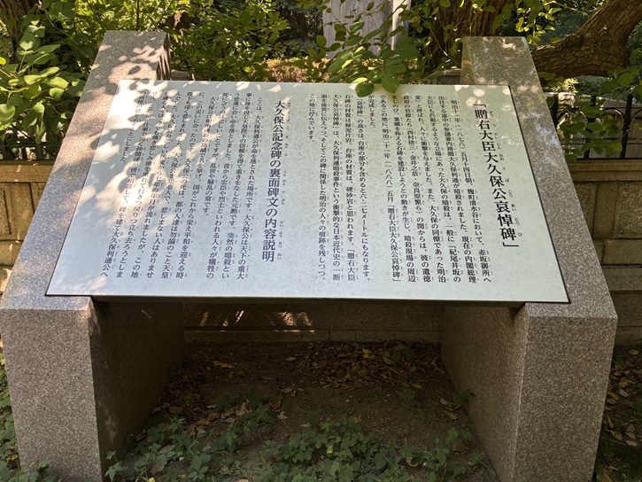ここは、大久保利通公が命を落とされた場所です。大久保公は天下の重大事に身を投じ天皇陛下の信頼を得て重きをなした元勲です。突然の暗殺という悲運に会い命を落としました。昔から忠臣や烈士といわれる人々が犠牲の死に会うのは悲しいことですが、乱世や騒乱の常です。大久保公は明治維新の功績で名を挙げ、国がこれから栄え平和を迎える時に、この災いに会ったのです。大久保公の死は、都の人達は勿論のこと天皇陛下も深く悲しまれました。大久保公を知る人で、悲しまない人はありませんでした。大久保公の悲しい凶変から七年の年月が流れましたが、この地を通る人々は、今でも嘆き悲しみ頭を垂れて行きつ戻りつ立ち去ろうとしません。ここに、仕事で働く仲間達が皆で相談して、碑を建て大久保利通公への哀悼の意を示すことにしました。