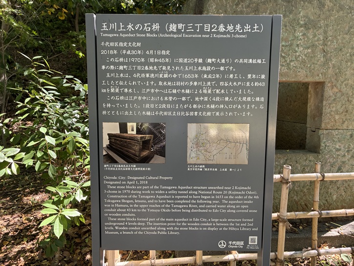These stone blocks are part of the Tamagawa Aqueduct structure unearthed near 2 Kojimachi 3-chome in 1970 during work to widen a utility tunnel along National Route 20 (Kojimachi Odori). Construction of the Tamagawa Aqueduct is reported to have begun in 1653 on the order of the 4th Tokugawa Shogun, Ietsuna, and to have been completed the following year. The aqueduct intake was in Hamura, in the upper reaches of the Tamagawa River, and carried water along an open conduit about 43 km to the Yotsuya Okido before being distributed to Edo City along covered stone or wooden conduits. These stone blocks formed part of the main aqueduct in Edo City, a large-scale structure formed underground 4 levels-deep. The insertion point for the wooden conduit is between the 1st and 2nd levels. Wooden conduit unearthed along with the stone blocks is on display at the Hibiya Library and Museum, a branch of the Chiyoda Public Library.