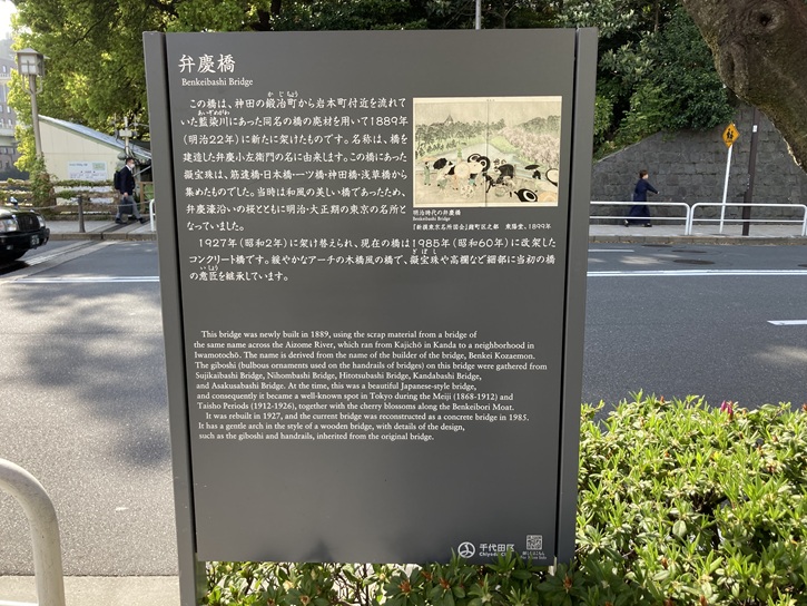 This bridge was newly built in 1889, using the scrap material from a bridge of the same name across the Aizome River, which ran from Kajicho in Kanda to a neighborhood in Iwamotocho. The name is derived from the name of the builder of the bridge, Benkei Kozaemon. The giboshi (bulbous ornaments used on the handrails of bridges) on this bridge were gathered from Sujikaibashi Bridge, Nihombashi Bridge, Hitotsubashi Bridge, Kandabashi Bridge, and Asakusabashi Bridge. At the time, this was a beautiful Japanese-style bridge, and consequently it became a well-known spot in Tokyo during the Meiji (1868-1912) and Taisho Periods (1912-1926), together with the cherry blossoms along the Benkeibori Moat. It was rebuilt in 1927, and the current bridge was reconstructed as a concrete bridge in 1985. It has a gentle arch in the style of a wooden bridge, with details of the design, such as the giboshi and handrails, inherited from the original bridge.
