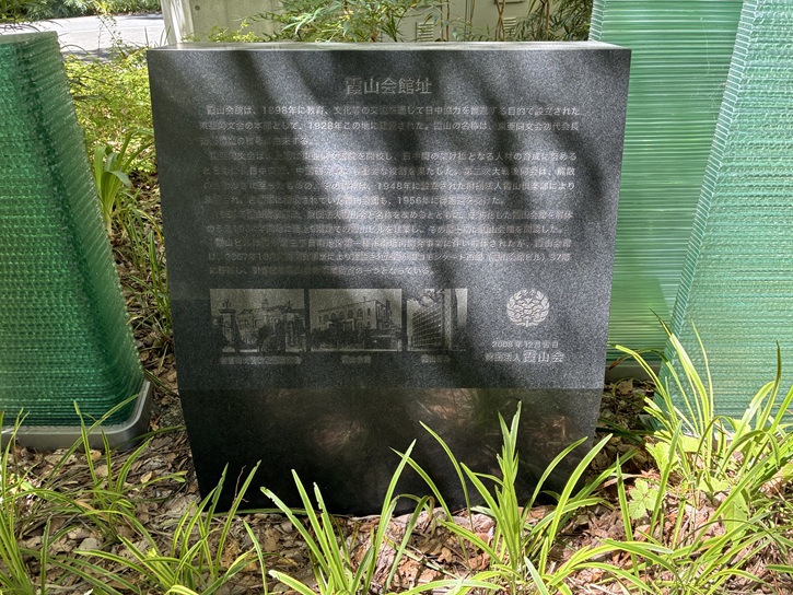 霞山会館は、1898年に教育、文化等の交流を通じて日中協力を推進する目的で設立された東亜同文会の本部として、1928年この地に建設された。霞山の名称は、東亜同文会初代会長近衛篤麿の雅号に由来する。東亜同文会は、上海に東亜同文書院を開校し、日中間の架け橋となる人材の育成に努めるとともに、日中交流、中国研究等にも重要な役割を果たした。第二次大戦後同会は、解散の止むなきに至ったものの、その精神は、1948年に設立された財団法人霞山倶楽部により承継され、占領軍に接収されていた震山会館も、1956年には返還を受けた。1958年霞山倶楽部は、財団法人霞山会と名称を改めるとともに、老朽化した霞山会館を解体のうえ1954年同地に地上9階建ての霞山ビルを建築し、その最上階に霞山会館を開設した。霞山ビルは霞が関三丁目南地区第一種市街地再開発事業に伴い解体されたが、霞山会館は、2007年10月同再開発事業により建設された霞が関コモンゲート西館(霞山会館ビル)37階に移転し、引き続き霞山会の事業拠点の一つとなっている。