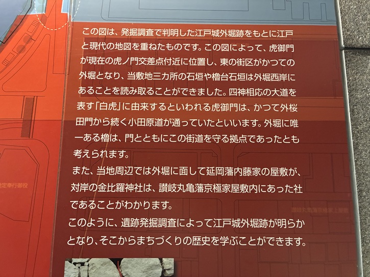 この図は、発掘調査で判明した江戸城外堀跡をもとに江戸と現代の地図を重ねたものです。この図によって、虎御門が現在の虎ノ門交差点付近に位置し、東の街区がかつての外堀となり、当敷地三カ所の石垣や櫓台石垣は外堀西岸にあることを読み取ることができました。四神相応の大道を表す「白虎」に由来するといわれる虎御門は、かつて外桜田門から続く小田原道が通っていたといいます。外堀に唯一ある櫓は、門とともにこの街道を守る拠点であったとも考えられます。また、当地周辺では外堀に面して延岡藩内藤家の屋敷が、対岸の金比羅神社は、 讃岐丸亀藩京極家屋敷内にあった社であることがわかります。このように、遺跡発掘調査によって江戸城外堀跡が明らかとなり、そこからまちづくりの歴史を学ぶことができます。