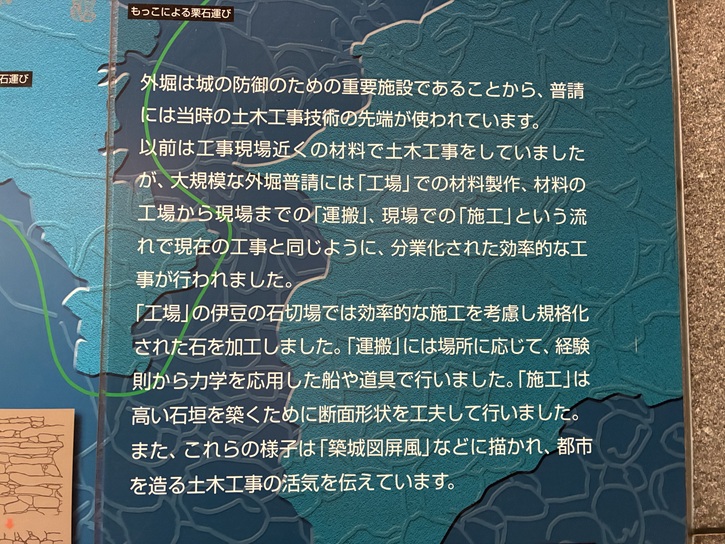 外堀は城の防御のための重要施設であることから、普請には当時の土木工事技術の先端が使われています。以前は工事現場近くの材料で土木工事をしていましたが、大規模な外堀普請には「工場」での材料製作、材料の工場から現場までの「運搬」、現場での「施工」という流れで現在の工事と同じように、分業化された効率的な工事が行われました。「工場」の伊豆の石切場では効率的な施工を考慮し規格化された石を加工しました。「運搬」には場所に応じて、経験則から力学を応用した船や道具で行いました。「施工」は高い石垣を築くために断面形状を工夫して行いました。また、これらの様子は「築城図屏風」などに描かれ、都市を造る土木工事の活気を伝えています。