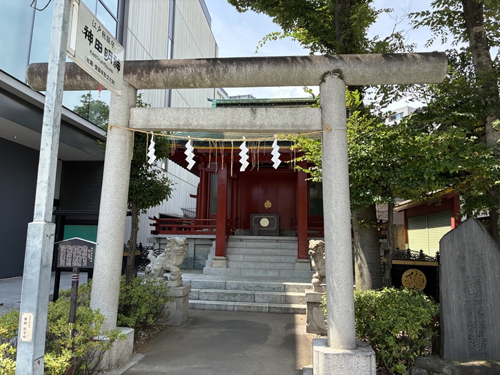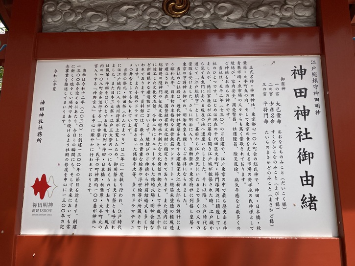 創建1300余年の神田明神は、江戸の総鎮守。当初は、平将門の首塚付近(大手町)で起こる祟りを鎮めるために、首塚近くに創建された。江戸城の表鬼門となる現在の場所に移ったのは元和二年(1616年)。境内には「銭形平次捕物控」で人気の平次の碑もある。