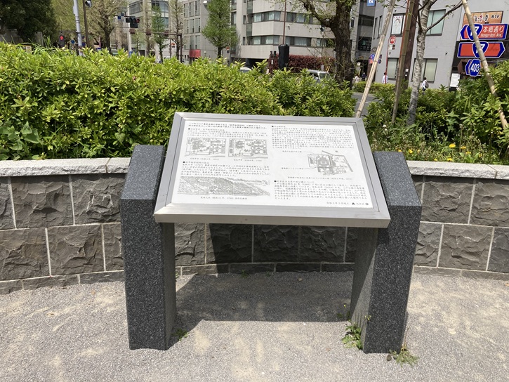 正面にある石垣は、江戸城外郭門のひとつである赤坂御門の一部で、この周辺は「江戸城外堀跡」として国の史跡に指定されています。江戸城の門は、敵の進入を発見する施設であるため「見附」とも呼ばれ、ふたつの門が直角に配置された「枡形門」の形式をとっています。赤坂御門はその面影をほとんど残していませんが、現在でも旧江戸城の田安門や桜田門には同じ形式の門をみることができます。赤坂御門は、寛永十三年(1636年)に筑前福岡藩主黒田忠之により、この枡形石垣が造られ、同十六年(1639年)には御門普請奉行の加藤正直・小川安則によって門が完成しました。江戸時代のこの門は、現在の神奈川県の大山に参拝する大山道の重要な地点でもありました。明治時代以降、門が撤廃され、その石垣も図のように大部分が撤去されましたが、平成三年の地下鉄南北線建設工事に伴う発掘調査によって地中の石垣が発見されました。現在、右手の石垣の下には、発掘調査によって発見された石垣が現状保存されています。
